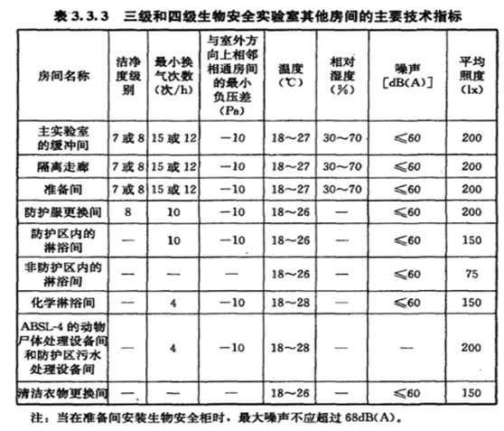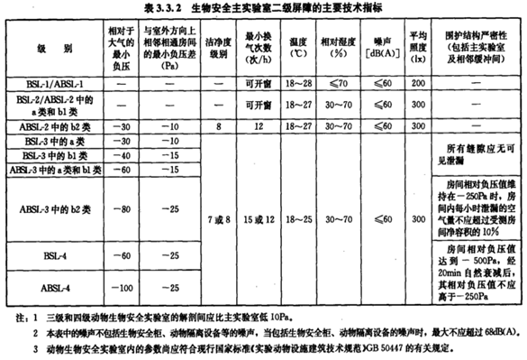 生物安全實驗室主要技術指標應滿足下表要求: